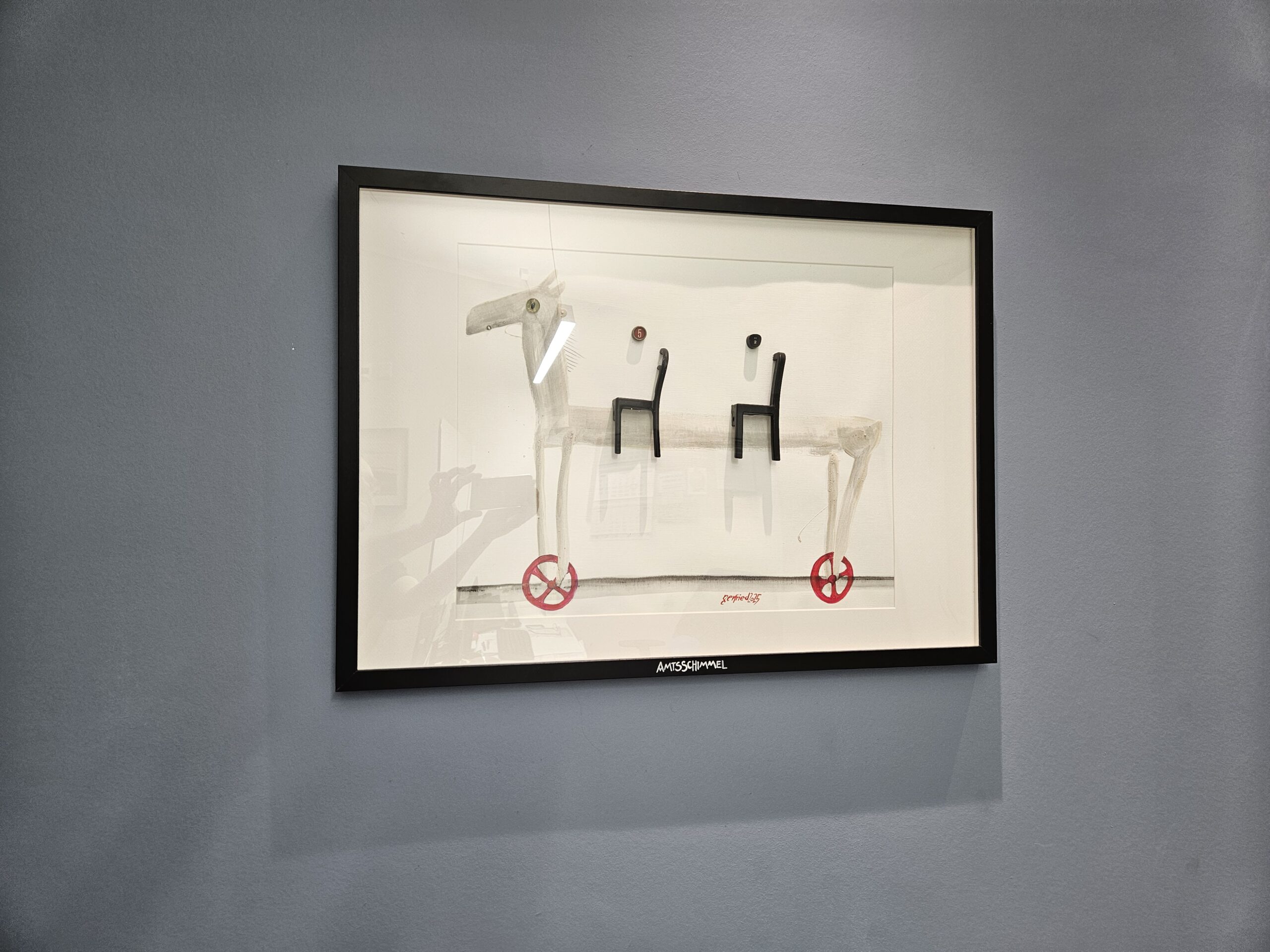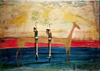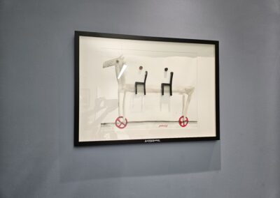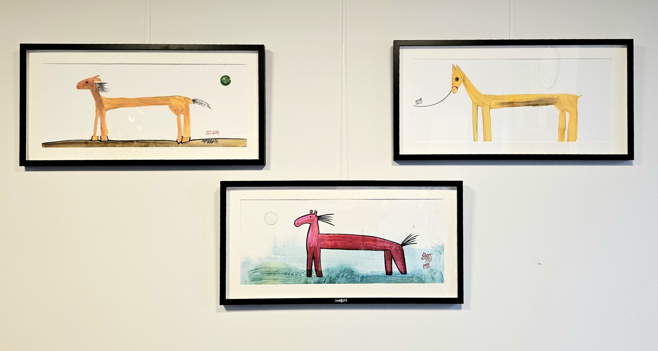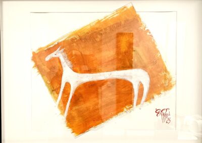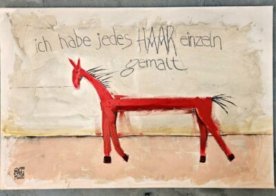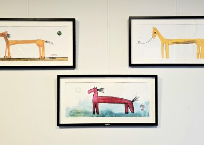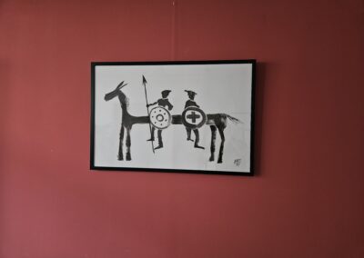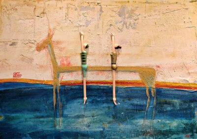 Nach 25 Jahren, einem kurzen Ausflug in die Töpferei, einem medizinischen Abenteuer und dem Zauber der Goldschmiedekunst, hat er sich endlich wieder die Klassiker – Stift, Pinsel und Zange – geschnappt. Die fehlende Übung ist nicht zu übersehen, aber gerade das macht seine Werke so charmant. Besonders die überlangen Pferde mit ihren zwei Reitern, die er in allerlei Techniken und Materialien zum Leben erweckt, wirken wie aus einer anderen Welt – oder eben der Antike.