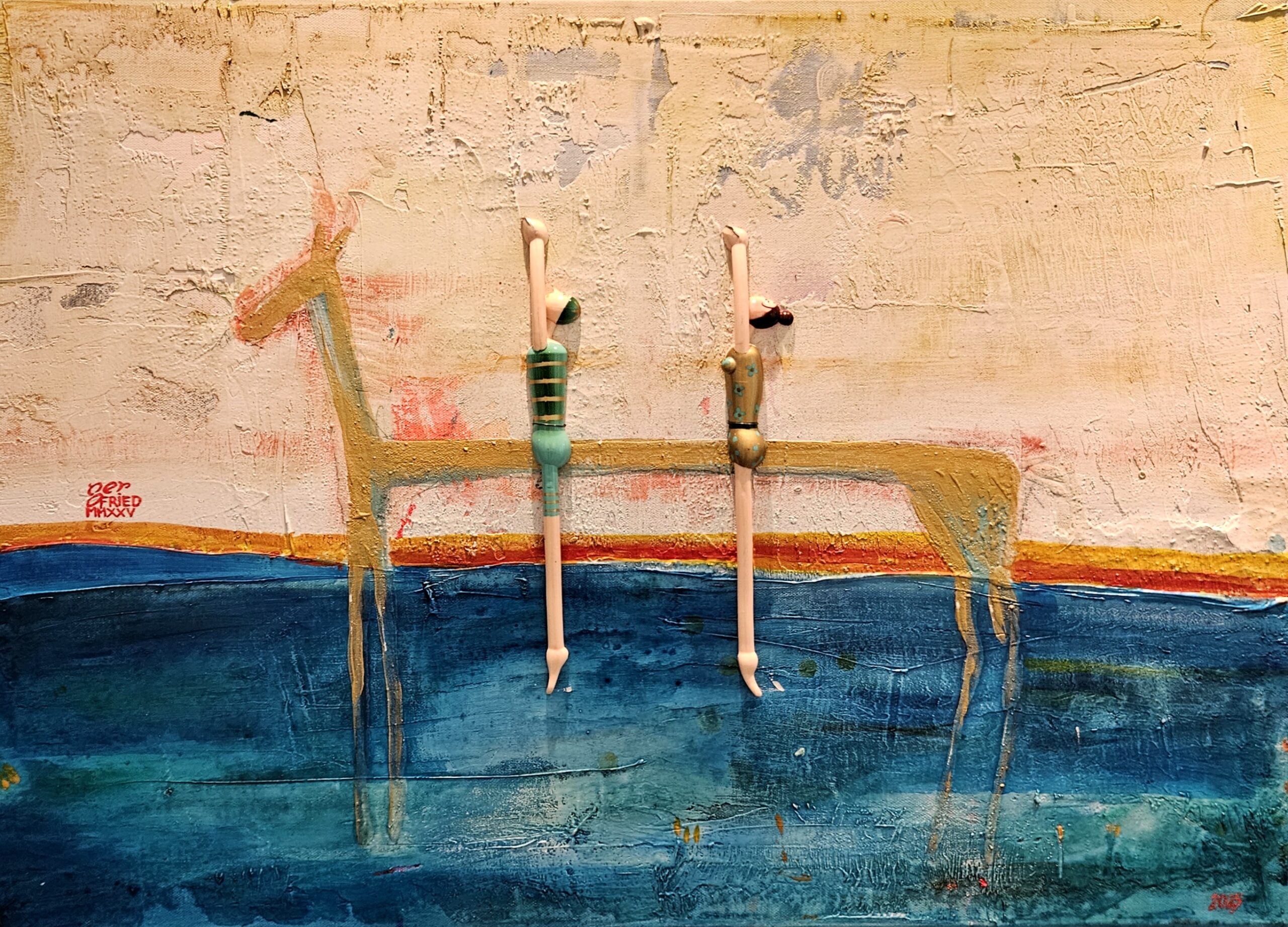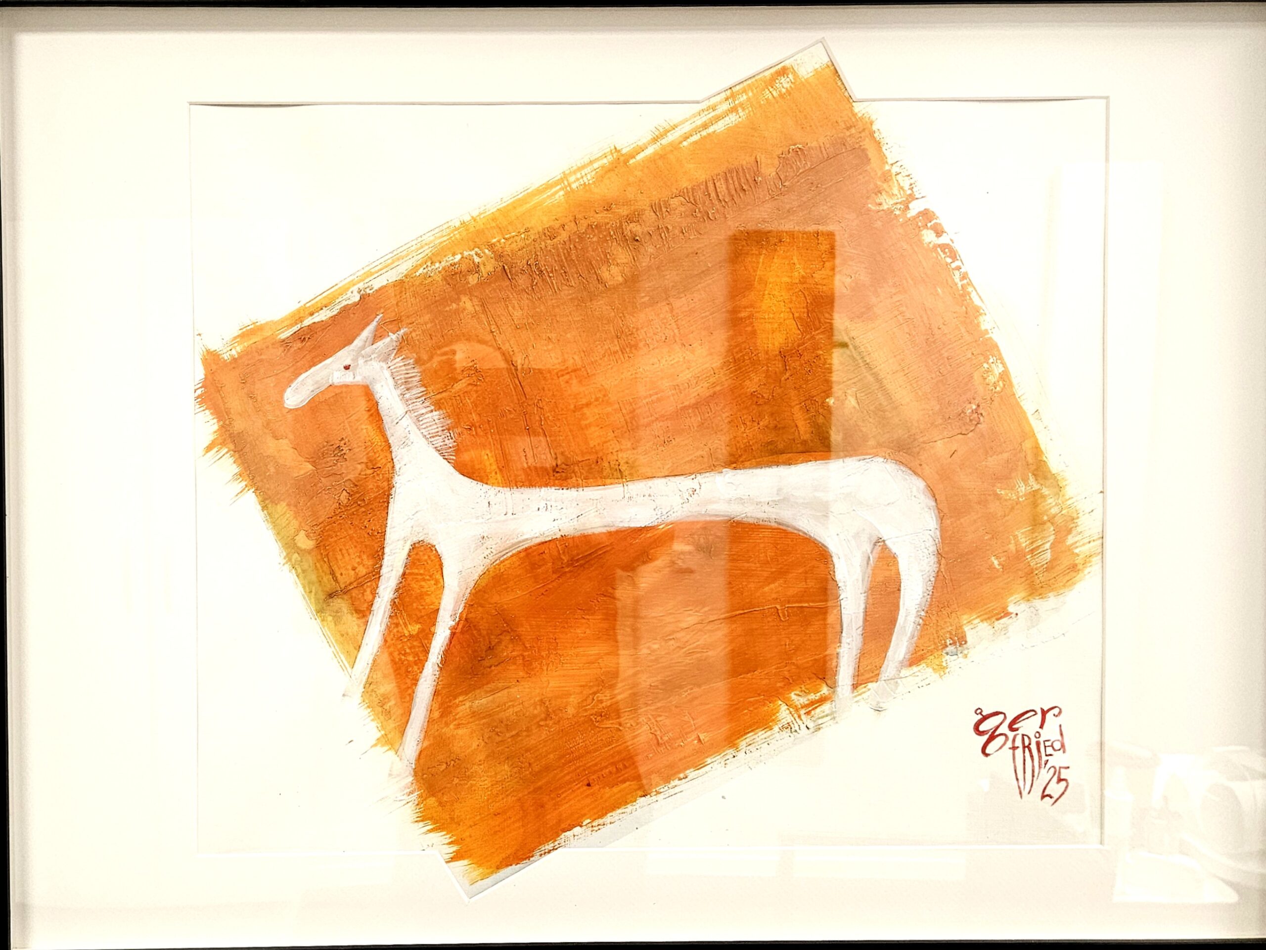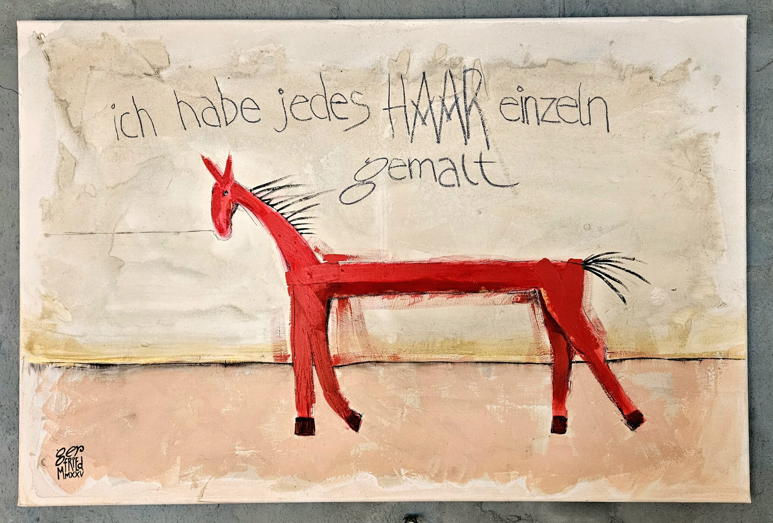 Nach 25 Jahren, einem kurzen Ausflug in die Töpferei, einem medizinischen Abenteuer und dem Zauber der Goldschmiedekunst, hat er sich endlich wieder die Klassiker – Stift, Pinsel und Zange – geschnappt. Die fehlende Übung ist nicht zu übersehen, aber gerade das macht seine Werke so charmant. Besonders die überlangen Pferde mit ihren zwei Reitern, die er in allerlei Techniken und Materialien zum Leben erweckt, wirken wie aus einer anderen Welt – oder eben der Antike.